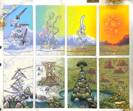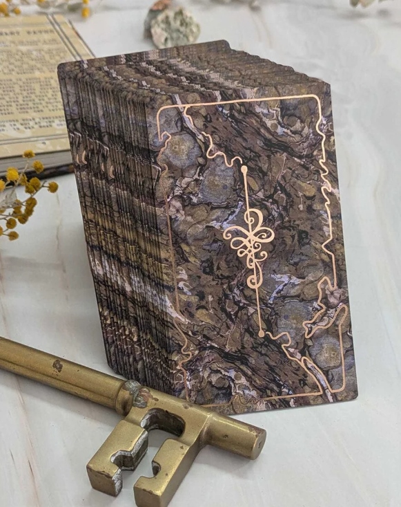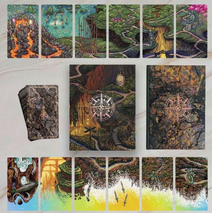 There are so many paths. If anything, this life has taught me that paths are infinite. Many versions of ourselves unfold into other realities of our own existence. For every choice we make and do not make, another version of ourselves exists in another dimension, in another reality. The Oracle of Many Paths is a deck of 78 tarot-sized cards. Each card alone tells a story, some sad, some victorious. As a whole, the 78 cards form a map to a forgotten land, and reveal how interconnected everything truly is. The interconnectedness of these cards shows how tarot is a balanced world with an endless array of beginnings. I took the 78 pieces of the map and applied my knowledge of tarot. Each of the 78 cards slowly revealed themselves: the fool: a crossroads, the magician: a manifested city, and the high priestess: a midnight pilgrimage. Tarot gave the map life, the beating heart that it was missing. Stories unfolded and intertwined across the map. The Oracle of Many Paths includes 78 cards and a 108-page hardcover guidebook THE CARDS: 78 cards that form one full image The Oracle of Many Paths includes 78 high-quality tarot-sized (2.75" x 4.75") cards with gilded edges and foil accents. Each card has a number (00-77) that can be easily referenced in the included book. The back of the cards are identical. Cards are illuminated with rose gold foil accents. The cards have metallic dark forest green gilded edges. The marbling pattern is something that I created with traditional Ebru marbling techniques. THE BOOK: 108 pages, full color, fabric-bound hardcover book The book is around 100 pages and is in full color. The cover of the book is wrapped with marbled fabric and stamped with a foil compass. Within the book is a 25-page introduction to the Oracle, 5 unique spreads, and notes on Numerology, Tarot, and deciphering paths. Each card has its own dedicated page that includes: KEYWORDS NUMEROLOGY TYPES OF PATHS NOTES POINT OF INTEREST LORE